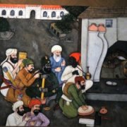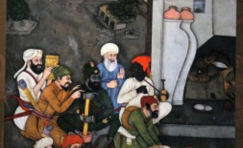 | A Mughal painting shows two Africans in a group sharing a light moment. It hints at a more open-minded Indian society. |