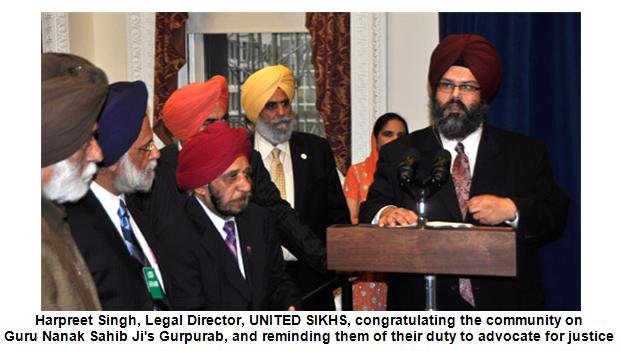 Harpreet Singh, Legal Director, UNITED SIKHS spoke at the event, stating, “The Sikh community remembers that Guru Nanak Sahib Ji's teachings emphasized speaking forcefully against social evils and injustices. It is pertinent that Sikhs follow Guru Sahib's teaching and speak out against civil, human and religious rights violations of Sikhs and others. Sikh Americans must be pro-active in advocating for their rights and press the government to address issues of employment discrimination, bullying in schools against Sikh children, hate and bias crimes, and religious and racial profiling at airports and borders. Finally, Sikhs must work together to be able to practice their faith freely and wear all five kakaars (articles of faith), including the kirpan (religious sword), at all times, whether in the military, law enforcement, at school, or at events like this one.” We will be having meetings with high level administration officials regarding the kirpan in the weeks to come.