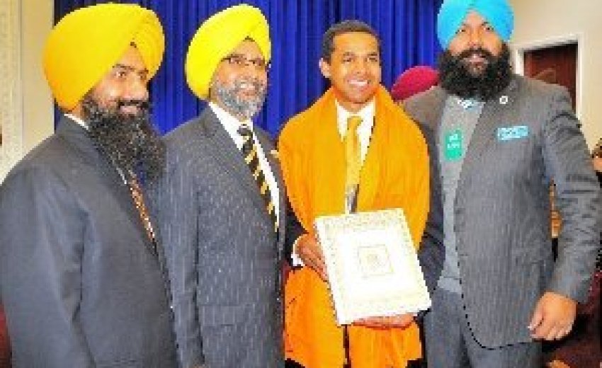| Joshua DuBois is being honored by Dr. Jaswant Singh Sachdev of Phoenix, Dr. Jasbir Singh Bhatia of Orlando, Sarbjeet Sandhu of San Jose and Dr. Darshan Sehbi of Cincinnati. |