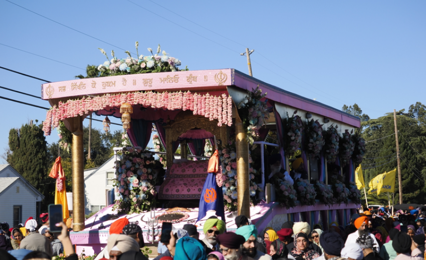 The Panj Pyare (five beloved ones) assemble with swords raised. Ardas is done, and an Attendant carries the Guru Granth Sahib from the gurdwara to the float atop his head. Another attendant follows behind with an Umbrella raised over the Guru Granth Sahib. Worshipers gather around and observe as they mount the canopied float that will carry Guru Granth Sahib through the streets of Yuba City.