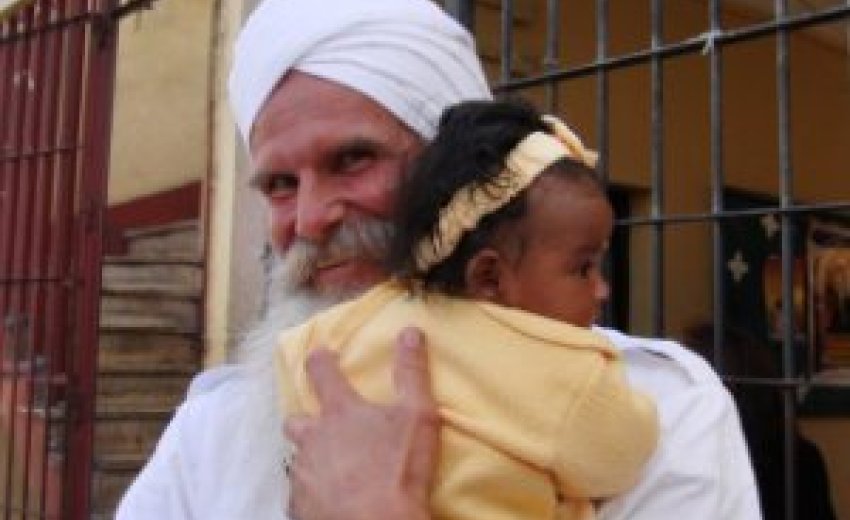 | Dr Ardas Singh embraces a Peruvian baby at the Women's Prison in Lima. |