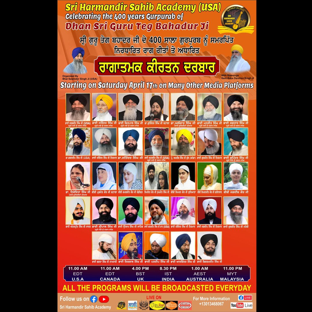 Live kirtan will be broadcast daily at various times celebrating the 400 years Gurpurab of Dhan Sri Guru Teg Bahadur Ji.