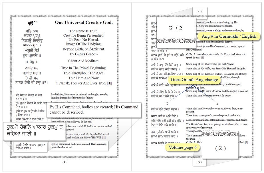 You will notice numbers at the tops and bottoms of each page. The numbers at the top relate to the proper Gurmukhi Angs of the Siri Guru Granth Sahib. The same number is written in Gurmukhi as well as English. You will notice bold numbers inline where there is a Siri Guru Granth Sahib Ang change.