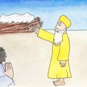 Guru Ji kept madly walking on and by this time the only ones left were two Sikhs, Bhai Lehna, the Yogi and the Guru. They kept on walking. They came to a corpse lying in the road. It was covered with a sheet and it smelled really bad. “Okay!” said the Guru. “Stop here. I want you to eat this corpse.” The two Sikhs didn’t know what to do with such a weird command, they simply turned and ran away. Bhai Lehna Ji only knew to obey his Guru out of love, he said “Where shall I start? At the head or the toes?” Guru Nanak yelled, “Start in the middle!!” Bhai Lehna devotedly went to the corpse to do as he was told, and when he lifted the sheet off the body something had changed. The awful smell of the dead body had turned sweet. Under the sheet all he saw was Prashad!