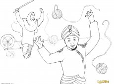 Near his house there was an old woman who spun yarn and she used a wheel to spin raw cotton into yarn balls. One day Gobind Rai decided to make a little mischief, and he snuck up behind her chair. She couldn’t see him and suddenly he knocked her basket of yarn balls on the ground and ran away. The balls of yarn had taken ages to spin and got all dirty and dusty. So the old woman got really angry with him. She picked up a big stick and waved it wildly in her hand while shouting at Gobind Rai, "Come here you little brat! I've been working on that basket of yarn all day. How dare you knock it down!" She chased him, thinking she would give him a sound beating with the stick. She yelled, "I don't care who your parents are, I'll teach you some manners! Come here boy!" She almost caught him. "Now I gotcha!" she crowed. But he just ran away faster. He kept stopping and starting, dancing near to the old woman but not letting her catch him, and it was really driving the old woman up the wall.