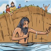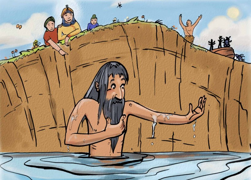 Suddenly, from behind, Gobind Rai snuck up behind him and pushed him completely in the water! The man was shocked and angry. He had gotten soaking wet and he was ill. That was it! He was about to punish the boy who pushed him in, and approached him shouting "You little brat!" But then he noticed something amazing... his body had stopped hurting. He had a sensation of coolness and his skin felt soft and soothed. He looked at himself and realized he had been cured! His body was totally healthy.