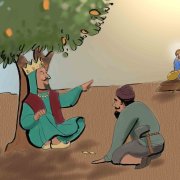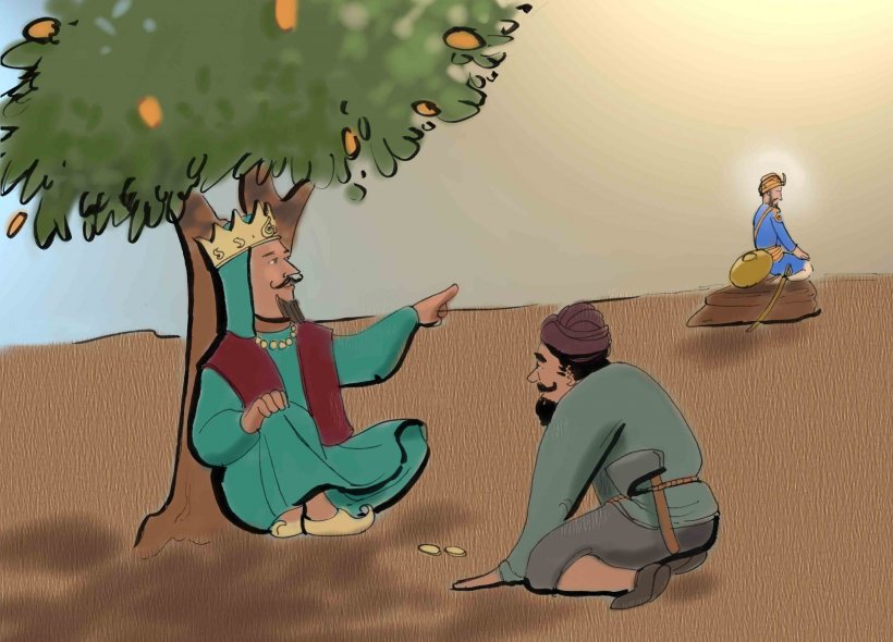 The Emperor heard this but he was still not satisfied and he returned to his tent in the camp. Later that day a poor young grass cutter from the area heard that the Guru's camp was nearby! He immediately came to the Guru's camp and asked a sevadar innocently, "is the True Emperor here?! I heard he is camping here. Please tell me where he is; I would like to pay my respects." The sevadar thought he was talking about Jahangir and said, "Oh yes, the emperor is sitting under the shade of that tree right over there." The grass cutter ran over to the tree and put a penny in front of the Emperor. Thinking it was Guru Hargobind, he bowed at his feet and prayed, "O True Emperor, all other kings are false. They rule for a short time but your rule is forever and beyond this world. Bless my soul, wash away my karmas and please accept me into your house of wisdom and light. It is you who can give true protection; it is YOU who saves!" Jahangir was confused and looked around, explaining, "This man wants me to bless his soul and save him from spiritual darkness, but I do not have the power to do that. I can't even save my own life, how can I save his soul?"