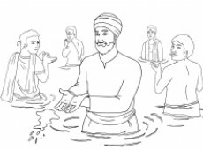 Guru Nanak traveled everywhere with his faithful companion Mardana. One day he made his way to a sacred place called Hariduar, which means “God’s Gate.” This place, where three holy rivers join together was said to have been blessed by the gods, Shiva, Brahma and Vishnu. Huge crowds of people gathered there,. They were chanting and praying. Led by so-called holy men, called Brahmins, the people threw water towards the morning sun to honor people in their families who had died. As this huge crowd of people chanted and threw water, Guru Nanak went into the river too and he also began throwing water.