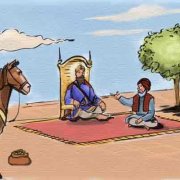 Then one day, a man came in to sing Jap Ji like everyone else. This man had great devotion in him, and he sang with deep purity and beauty. While this man was singing Jap Ji, the Sikhs of Guru Hargobind noticed that the Guru was slowly moving off his throne. They didn’t understand. Toward the end, after Guru Hargobind had gotten nearly completely off his thrown, Guru Hargobind jumped back onto his throne. When the man finished, Guru Hargobind blessed him and then offered him a beautiful horse and some gold for how beautifully he sang Jap Ji Sahib. “Oh my God, Guru Ji, thank you so much! You’ve given me much gold and wealth and a what a wonderful horse you have given to me also! I am so blessed to serve you my King!” Then he bowed down to the Guru, took the horse and gold, and happily went back to his wife and his home.