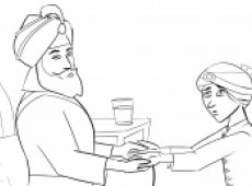 Soon enough the boy proudly came back with a glass of water. Guru ji said, “Your hands look soft. What do you do for work?” The boy said, “My parents have a ton of money, so I don’t need to work. Whenever I want something, I ask a servant for it... The servants are well paid... so everyone is happy.” It’s true, his parents spoiled him, they never even had him do chores or even clean his room! He had a very soft and easy life; other people did everything for him. Guru ji asked “You never work?” “True King, you are such an inspiration. You are the first person I’ve even thought of serving! This is the first time I have gotten water for anyone.”
