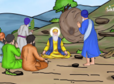 Guru Nanak Dev Ji used to travel on foot everywhere with his companions and musicians, Bala and Mardana. One day they were walking and Mardana felt very thirsty. It was very hot outside and they had been walking for a long time. Finally they reached a hill with a dwelling at the top. They were sure they would be able to get water there. A man lived there and had a well that everyone in the nearby village used to get water for washing themselves, growing food, and drinking. But he was very greedy and charged money before anyone could use the well.